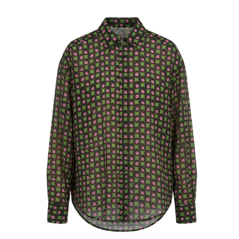 Finished with a classic collar and front button closure. Defined by its all-over print.